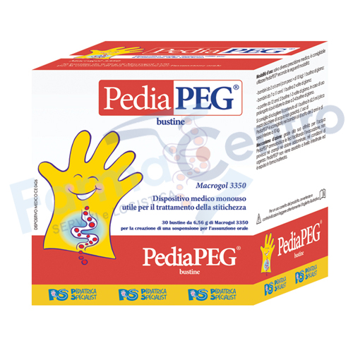 Descrizione Dispositivo medico ad azione lassativa che, attraverso un’azione di tipo osmotico, regolarizza l’intestino in modo naturale. Non viene assorbito né fermenta nell’intestino, non irrita la mucosa e viene eliminato nelle feci in forma non modificata. PediaPEG® è particolarmente indicato nella stitichezza cronica e nei casi di intestino occasionalmente irregolare. Grazie infatti alla sua affinità per l’acqua, PediaPEG® ammorbidisce le feci facilitando l’evacuazione senza provocare crampi né dolore addominale, né condizioni di urgenza. La sua efficacia non si riduce nel tempo. Ingredienti Ogni bustina di PediaPEG contiene 6,563 g di Macrogol 3350. Eccipienti: biossido di silicio, aroma, saccarina sodica. Senza glutine e lattosio. Modalità d'uso - Bambini da 2 ai 6 anni (con peso > di 10 kg): 1 bustina al giorno. - Bambini da 7 a 11 anni: 1 bustina 2 volte al giorno. - Adulti e bambini al di sopra di 12 anni: 2 bustine 1-3 volte al giorno. In caso di uso prolungato ridurre la dose a 2-4 bustine al giorno. Sciogliere il contenuto di una bustina in mezzo bicchiere d’acqua non gasata (circa 62,5 ml). È possibile dividere il dosaggio giornaliero in più somministrazioni. La dose potrebbe essere aumentata o diminuita in base all’individuale risposta al trattamento. È raccomandato, in ogni caso, di chiedere un parere al proprio medico. Usare il prodotto nei bambini solo dopo consiglio medico. Normalmente il dosaggio massimo non deve superare 6 bustine al giorno. Avvertenze Tenere fuori dalla portata dei bambini. La soluzione orale deve essere preparata al momento dell’assunzione. Non usare il dispositivo in bambini sotto i due anni di età. Non superare assolutamente le dosi consigliate: in caso di sovradosaggio possono manifestarsi effetti collaterali inaspettati. In gravidanza o allattamento assumere PediaPEG solo dopo avere consultato il medico. Durante il trattamento con PediaPEG è consigliabile seguire una dieta adeguata, accompagnata dalla somministrazione di una soluzione per la reidratazione orale (ORS) per evitare la disidratazione, si consiglia comunque di consultare il medico. Non usare PediaPEG per più di 30 giorni consecutivi, se i sintomi persistono consultare il medico. Non usare in caso di intolleranza al prodotto. Non usare in caso di ipersensibilità nota ai componenti e al polietilenglicole. Ogni bustina è monouso e dovrebbe essere aperta solo al momento dell’uso. Non assumere PediaPEG® in caso di: stenosi intestinale, perforazione intestinale, malattie infiammatorie dell’intestino (come esempio morbo di Crohn, colite ulcerosa). Non assumere in caso di ostruzione intestinale. Non ci sono esperienze sull’assunzione durante la gravidanza e l’allattamento pertanto assumere PediaPEG® solo in caso di reale necessità su consiglio medico. In pazienti con problemi renali non è necessario aggiustare il dosaggio. La durata del trattamento con PediaPEG® non dovrebbe eccedere le due settimane. In caso di necessità ripetere il trattamento. Un uso prolungato può essere necessario in caso di costipazione refrattaria e/o cronica. Tale costipazione può essere causata da medicinali antidolorifici (oppioidi) e per il trattamento del Parkinson (anticolinergici) o comparire in caso di patologie come sclerosi multipla o morbo di Parkinson che possono causare stipsi refrattaria. Conservazione Conservare la confezione integra in un luogo asciutto e al riparo da fonti luminose o di calore dirette: aprire la bustina solo prima dell’utilizzo. Non utilizzare in caso di confezione danneggiata. Conservare il dispositivo al di sotto dei 25 °C. La data di scadenza si riferisce al prodotto in confezionamento integro, correttamente conservato. Formato Astuccio da 30 bustine da 6,563 g.